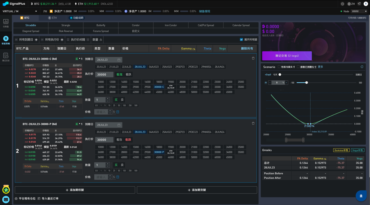 虚拟账户功能允许交易者模拟策略，使用风险/损益分析工具记录场外交易。